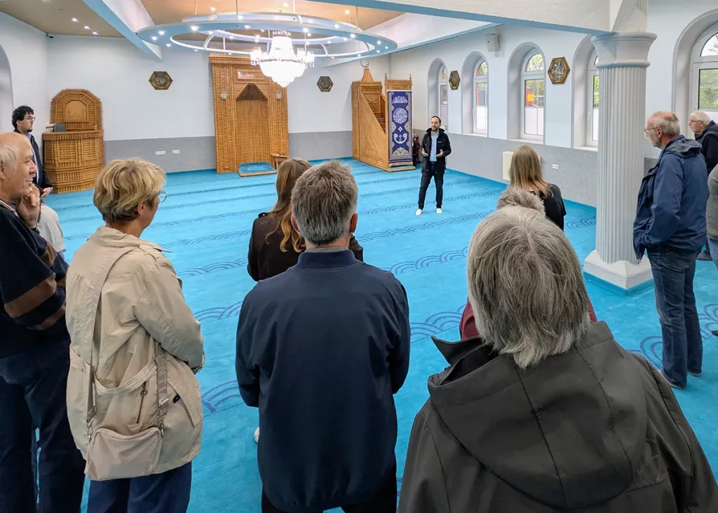 Ümit Dumann in seiner Funktion als Vereinsvorsitzender der Sultan Murad Moschee e.V. sowie der Religionsbeauftragte Mehmet Karahan begrüßten die Besuchergruppe und führten durch die Räumlichkeiten.